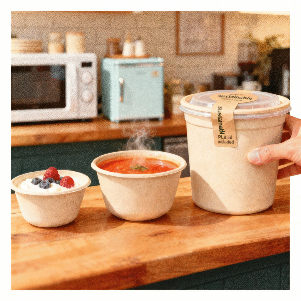 | Bowls & Soup Containers | Bagasse + optional PLA lid | 8 oz–32 oz | -20°C to 100°C | Soups, Sauces, Salads | Custom Colors & Printing |